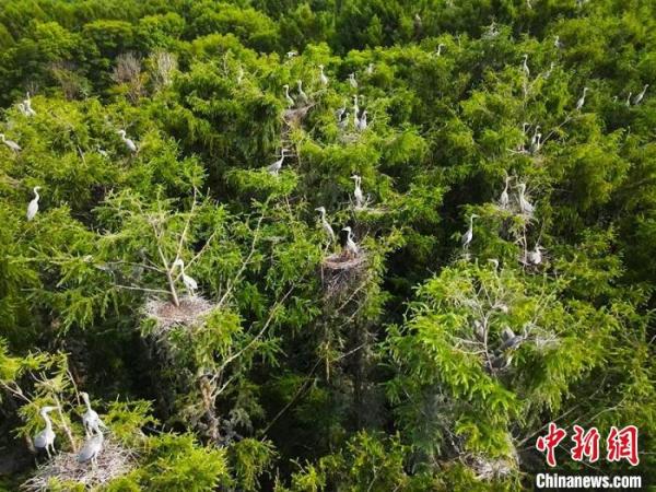 夏日的“鹭岛”林荫蔽日,在临水的松林,苍鹭群栖落枝头,时而展翅跃动,时而眺望远方。